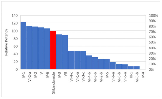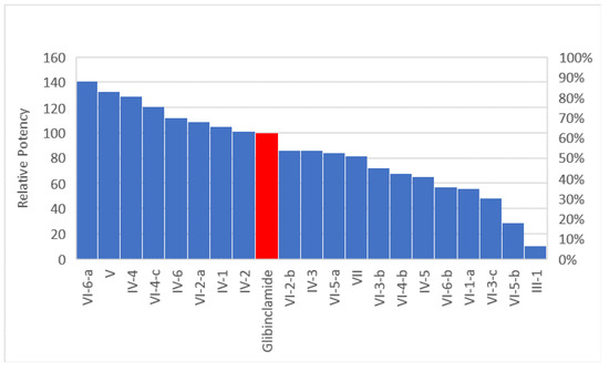 It is apparent that compounds VI-6-a, V, IV-4, VI-4-c, IV-6, VI-2-a, IV-1 and IV-2 are very promising compounds as they are more potent than glibenclamide by the end of the sixth day of treatment at 2 mg/kg dose level in diabetic rats. The maximum glucose lowering percentage by the end of the sixth day is 78.2% in comparison with a 55.4% decrease for glibenclamide. Figure 6 shows relative potency of the synthesized compounds in comparison to the reference glibenclamide.