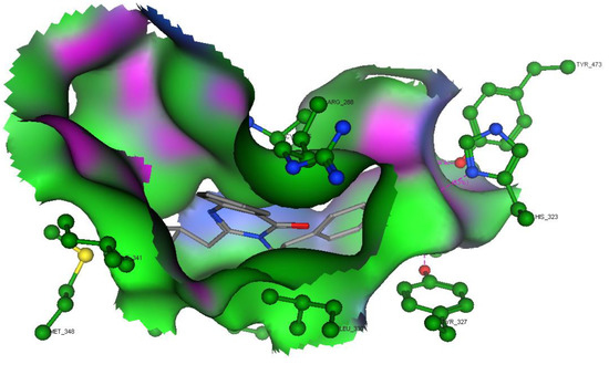 3D shape of compound IV-5 inside the pocket. Four hydrogen bonds (pink dots) with His323, Tyr327, and Tyr473 are shown.