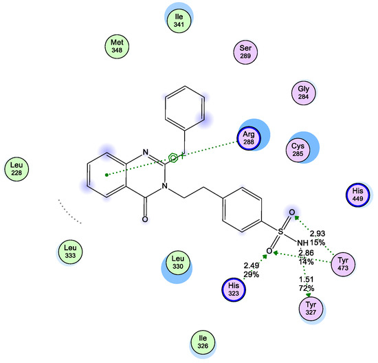Compound IV-5 as representative example exhibited a binding mode similar to that of rosiglitazone, with an extra hydrogen bond and affinity value of −12.48 kcal/mol. The sulfonamide group was oriented in the polar arm I of PPARγ and formed four hydrogen bonds, two with Tyr473 via SO2 group (distances 2.93 Å, 2.86 Å, scores = 15%, 14%), a hydrogen bond with Tyr327 via the NH group (distance = 1.51, score = 72%), and a hydrogen bond with His323 via SO2 (distance = 2.49, score = 29%). The quinazolinone moiety was oriented in the hydrophobic entrance forming pi-pi and pi-cation interactions with Arg288 (Figure 10). Figure 11 shows the 3D shape of compound IV-5 occupying the active pocket of PPARγ.