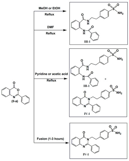 Trials to condense the bezoxazinone II-a with 4-(2-aminoethyl)benzenesulfonamide in order to get the target intermediate 2-Phenyl-3-(p-aminosulfonyl]phenylethyl)-2-phenyl-4(3H)-quinazolinone were summarized in Scheme 2 as follows: