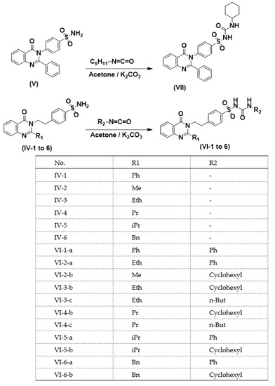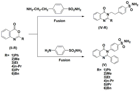 A mixture of equimolar quantities of the appropriate benzoxazinone (II) and the corresponding sulfanilamide or 4-(2-Aminoethyl)benzenesulfonamide (0.01 mole) were fused in a two neck flask attached to a reflux condenser for 1–3 h. The solid obtained was crystallized from ethanol to give the corresponding quinazolinones (IV-1–6).