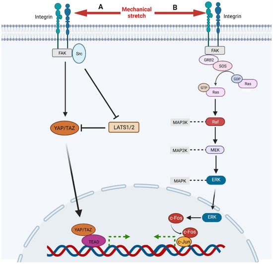 A, Mechanical stimulation, integrin-recruited FAK, and Src activate YAP/TAZ directly and facilitate its nuclear translocation. Meanwhile, FAK and Src can also inhibit LATS1/2, an inhibitor of YAP/TAZ, to activate YAP/TAZ signaling. Then, activated YAP/TAZ translocates to nuclear and binds to TEAD to regulate gene expression. B, Mechanical stimulation activates integrin which recruits and activates FAK. Then FAK activates Ras through GRB2 and SOS, initiating Ras-Raf-MEK-ERK cascade. Ultimately, activated ERK translocates to nuclear to up-regulates and activates c-Fos which binds c-Jun to regulate gene expression.