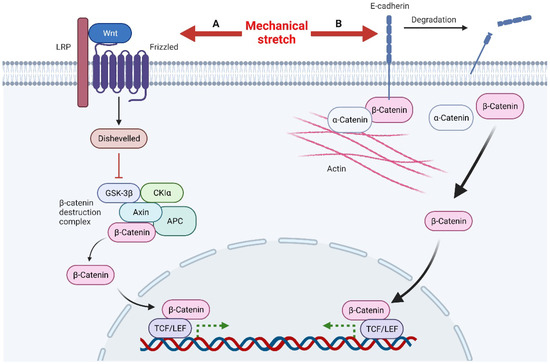 Mechanical stretch induces β-catenin activity through Wnt-protein-dependent and -independent ways. A, Mechanical stretch up-regulates Wnt proteins to activate Wnt signals. After Disheveled is recruited to inactivate the β-catenin destruction complex, this leads to the accumulation of β-catenin in the nucleus. β-catenin combines with the transcription factor TCF/LEF to regulate the transcription of target genes. B, Mechanical stimulation can also lead to the degradation of E-cadherin, releasing β-catenin in the E-cadherin binding pool, resulting in the accumulation of β-catenin in the nucleus and ultimately regulating the transcription of target genes.