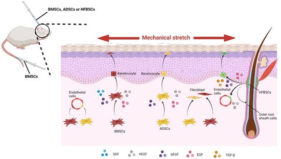 BMSCs are isolated from bone marrow and can be self-derived without immune rejection. Animal studies in murine animals and pigs have shown that mechanical stretch during skin soft tissue expansion promotes skin expansion by recruiting more BMSCs and facilitating their transdifferentiation [130]. A chimeric mouse model in which enhanced green fluorescent protein (EGFP) transgenic mouse bone marrow was transplanted into C57BL mice with the same genetic background through the tail vein was used in our previous work. We found that more BMSCs were recruited into the expanded skin and converted into vascular endothelial cells, epidermal cells, and spindle-shaped dermal fibroblasts [128]. In the pig experiment, it was found that local injection had a higher expansion effect than intravenous injection and BMSCs also promoted the secretion of growth factors, VEGF, bFGF, EGF, and SDF [131,132]. The way in which BMSCs promote expanded skin regeneration is illustrated in Figure 3.