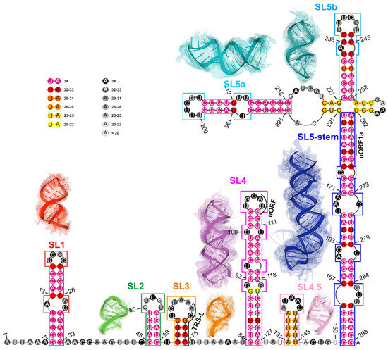 - Chen, S.C.; Olsthoorn, R.C. Group-specific structural features of the 5′-proximal sequences of coronavirus genomic RNAs. Virology 2010, 401, 29–41. [Google Scholar] [CrossRef] [PubMed]