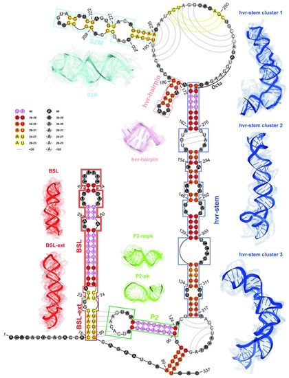- Rangan, R.; Watkins, A.M.; Chacon, J.; Kretsch, R.; Kladwang, W.; Zheludev, I.N.; Townley, J.; Rynge, M.; Thain, G.; Das, R. De novo 3D models of SARS-CoV-2 RNA elements from consensus experimental secondary structures. Nucleic Acids Res. 2021, 49, 3092–3108. [Google Scholar] [CrossRef]