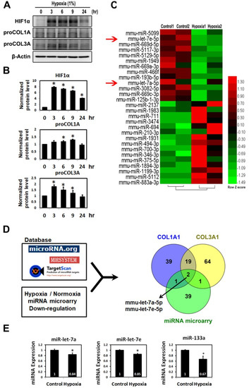 Differential expressions of proteins, mRNAs and microRNAs in hypoxic cardiomyocyte cells. (A) HL-1 cells were incubated under hypoxic conditions (1% O2) for the indicated times. The indicated proteins were detected in cellular homogenates by Western blot analysis. (B) qRT-PCR analysis of fibrotic mRNAs was performed. Error bars represent means ± SD from three independent experiments. * p < 0.01 vs. normoxia; vs. hypoxia + scramble control mimic (NC), n ≥ 3. (C) Heat map showing the results of hierarchical clustering present the distinct microRNA expression profiles between hypoxia and controls. (D) Venn diagram showing the overlap between hypoxia-responsive microarray miRNAs or collagen-specific miRNAs in HL-1 cardiomyocytes under hypoxia stress. The three circles represent predicted miRNA target genes found in the list of reported miRNA websites. (E) qRT-PCR analysis of mmu-miR-133a, mmu-let-7a and mmu-let-7e miRNA expression in HL-1 cell. Mean ± SD, n ≥ 3, * p < 0.05.