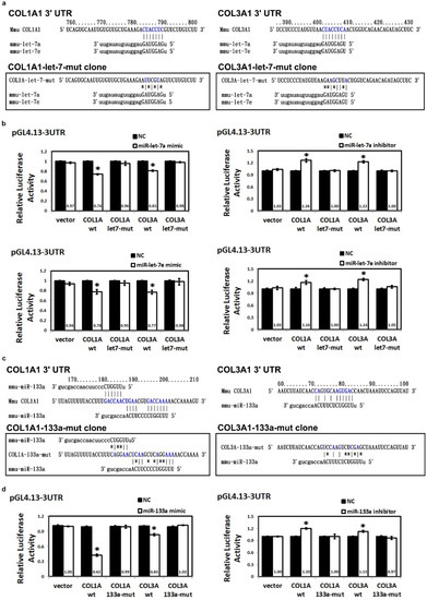 To further elucidate whether miR-133a and miR-let-7 interfere with COL1A1 and COL3A1 3′-UTR, pGL4.13-based plasmids containing binding sites for miR-133a or miRlet-7 were constructed. The 3′-UTR of COL3A1 also had putative binding sequences for miR-let-7 (Figure 2a), while COL1A1 and COL3A1 genes contained putative binding sites for miR-133a in the 3′-UTR region (Figure 2c). Subsequently, the ability of miR-133a and miR-let-7 to repress COL1A1 or COL3A1 expression was evaluated. In Figure 2b, a luciferase vector carrying the 3′-UTR of COL1A or COL3A was co-transfected with miR-let-7 mimic and inhibitor. Results indicated that after a co-transfection with miR-let-7 mimic, the luciferase vector carrying the 3′-UTR of COL1A or COL3A was co-transfected and luciferase activity was significantly diminished, compared to that after transfection with a negative control mimic. The inhibitory effect of miR-let-7 on COL1A and COL3A was antagonized by the miRNA inhibitor to induce COL1A or COL3A 3′-UTR luciferase expression. Similar results were found when COL1A or COL3A was co-transfected with miR-133a mimic and inhibitor (Figure 2d). There was also no significant difference in luciferase activity between plasmids containing a mutation of the COL1A or COL3A 3′-UTR + miRNA negative control (COL1A or COL3A let7-mut + NC) and the plasmid containing a mutation of the COL1A 3′-UTR + miRNA mimic or inhibitor (COL1A or COL3A let7-mut + miR-let-7 mimic, COL1A or COL3A let7-mut + miR-let-7 inhibitor in Figure 2b), (COL1A or COL 3A 133a-mut + miR-133a mimic, COL1A or COL 3A 133a-mut + miR-133a inhibitor in Figure 2d). All of these results confirmed that COL1A and COL3A were the targets of miR-133a and miR-let-7.