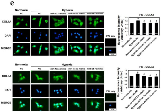 Regulation of collagen type 1A1 and 3A1 by miR-133a and let-7 family under hypoxic stress. (a) The HL-1 cells transfected with miRNA mimic were exposed to a hypoxic microenvironment and the levels of miR-133a, miR-let-7a and miR-let-7e were determined for transfection effectiveness from each group. (b) Western blotting analysis and quantification (c) of COL1A and COL3A protein expression in HL-1 cells transfected with the indicated mimic miRNA. (d) qRT-PCR analysis of COL1A1, COL1A2 and COL3A mRNA expressions in HL-1 cells transfected with the indicated mimic miRNA. Mean ± SD, n ≥ 3, * p < 0.05. (e) Effect of extracellular matrix shown by immunofluorescent green color expression in miR-133a and miR-let-7 family mimics treated in hypoxic HL-1 cells using an immunofluorescence assay. HL-1 cells were transfected with miR-133a mimic, miR-let-7a or miR-let-7e scramble control mimic (NC) and the expressions of COL1A and COL3A under hypoxic conditions were detected by immunostaining. Scale bar: 50 μm. Secondary antibody control slides for each group showed no COL1A or COL3A staining. The green intensity was quantified using ImageJ software and represents means ± standard error of the mean (SEM) from two independent experiments performed in duplicate (n > 150 cells, * p < 0.01 vs. normoxia, # p < 0.01 vs. hypoxia + NC control).