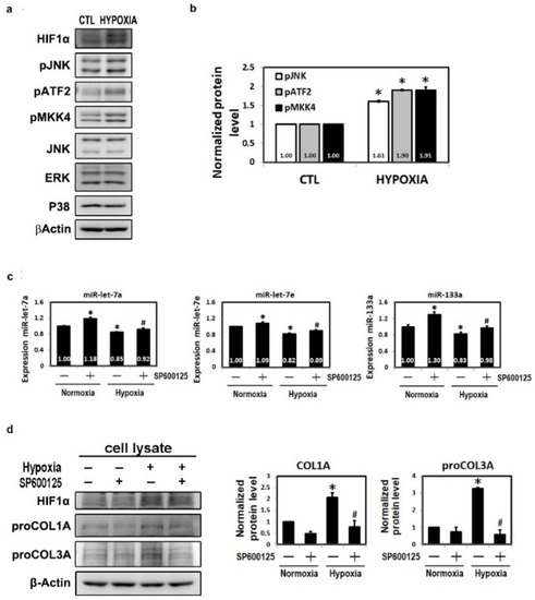 After blocking with 3% bovine serum albumin (BSA) for 1 h at room temperature, membranes were incubated with an indicated antibody against HIF-1α (Santa Cruz Biotechnology, Novus Biologicals, Centennial, CO, USA), proCOL1A, proCOL3A (Santa Cruz Biotechnology), p-ATF2, p-MKK4, JNK/SAPK, pJNK/SAPK (pT183/pY185) (Cell Signaling Technology, Danvers, MA, USA), p38 or ERK (BD Biosciences, Bedford, MA, USA) at 4 °C overnight while a duplicate membrane was probed with anti-β-Actin (Geneway) as control. The membranes were then incubated with a species-specific horseradish-peroxidase-labeled secondary antibody (BD Biosciences: 1:5000) for 1 h at 37 °C. Between steps, membranes were thoroughly washed with TBST. Peroxidase activity was detected on an LA4000 system (Fuji) using ECL detection reagents (Millipore) and quantified using a luminescent imager (LAS-1000 Image Analyzer, Fujifilm, Berlin, Germany) and FluorChem imaging software (Alpha Innotech, San Leandro, CA, USA) [16].