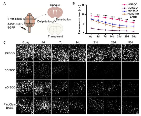 To examine the application of tDISCO for AAV-transduced EGFP fluorescence preservation, AAV2-Retro-EGFP was bilaterally injected into the cervical spinal cord. One-millimeter-thick brain slices were collected 2 w post-injection (Figure 1A). The clearing procedure for brain slices is described in Table 1. After simple dehydration and delipidation treatment, a sample became transparent after being immersed in RI-matching solutions. The cleared brain slices were mounted on slides before imaging. The EGFP+ neurons in the cortex were captured using a confocal microscope equipped with a 20× objective (NA, 0.8) at 0 to 56 days after clearing. Our strategy showed higher signals of endogenous EGFP fluorescence from 0 to 56 days after clearing compared with other solvent-based clearing methods (Figure 1B,C). We quantified the level of AAV-labeled EGFP fluorescence by tDISCO clearing over time compared with other representative solvent-based clearing methods. The level of fluorescence from cleared brain slices at day zero (tDISCO, 9.26 ± 0.42; uDISCO, 7.49 ± 0.39; FluoclearBABB, 7.28 ± 0.53; 3DISCO, 2.78 ± 0.31) showed that tDISCO improved the EGFP fluorescence by more than 20% (uDISCO and FluoclearBABB) and 200% (3DISCO). We also quantified the quenching rate at day 56 ((tDISCO, 37.9%; uDISCO, 48.7%; Fluoclear-BABB, 60.0%; 3DISCO, 58.7%), which suggested that tDISCO could preserve the endogenous fluorescence better. These data indicated that endogenous EGFP signals were preserved for months after tDISCO clearing, suggesting a more stable and long-term preservation capacity of tDISCO than the other three solvent-based clearing methods.