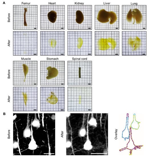 - Yang, B.; Treweek, J.B.; Kulkarni, R.P.; Deverman, B.E.; Chen, C.K.; Lubeck, E.; Shah, S.; Cai, L.; Gradinaru, V. Single-cell phenotyping within transparent intact tissue through whole-body clearing. Cell 2014, 158, 945–958. [Google Scholar] [CrossRef] [PubMed]