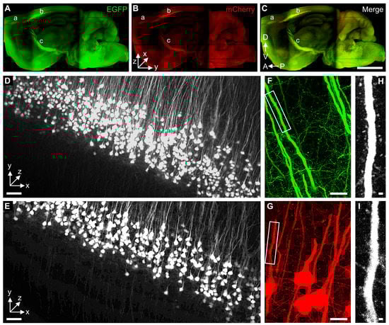 Global connectivity of supraspinal neurons and their axons can be depicted with retrogradely transducing AAV virus [25,26]. In order to test whether tDISCO can be used to visualize the whole brain labeled by AAV with EGFP and mCherry fluorescence proteins, AAV2-Retro-EGFP/mCherry was injected into the cervical spinal cord separately. Then, the brains were cleared by the tDISCO method. A series of images covering the whole brain was captured using light-sheet fluorescence microscopy. The supraspinal neurons located in the cortex, red nucleus, and reticular formation were labeled with EGFP and mCherry (Figure 4A–C). Consistent with previous studies of cervical projection CSNs [26,27], the EGFP+ and mCherry+ CSNs are located in separate areas in the cortex (Figure 4A–C): the rostral forelimb area (secondary motor cortex; Figure 4A–C a) and the central population (primary sensorimotor cortex; Figure 4A–C b). In addition to cell bodies, the axons of the corticospinal tract (CST) could be distinguished as they formed a unified tract before descending into the ventral medulla (Figure 4A–C c). High-resolution LSFM images in the cortex could be used to easily identify the structure of CSNs (Figure 4D,E and Supplementary Video S1). In order to image the dendritic spines of CSNs, the cleared whole brains were sliced into 2 mm thick coronal sections. The images were acquired using a confocal microscope equipped with a 40× objective (NA, 1.20) at a zoom of 2.0. In the high-resolution images in the cortex, the EGFP+ and mCherry+ dendritic spines could be reliably identified and reconstructed in 3D (Figure 4F–I). In order to test the preservation of mCherry fluorescence after tDISCO clearing, the cleared brain slice was imaged on day 4 and day 37. The merged image showed that the morphology of CSNs was well maintained, which is consistent with the matched outlines of EGFP+ CSNs mentioned above. The fluorescence intensity showed only a minor loss of mCherry signal on day 37 after tDISCO clearing (Supplementary Figure S3).