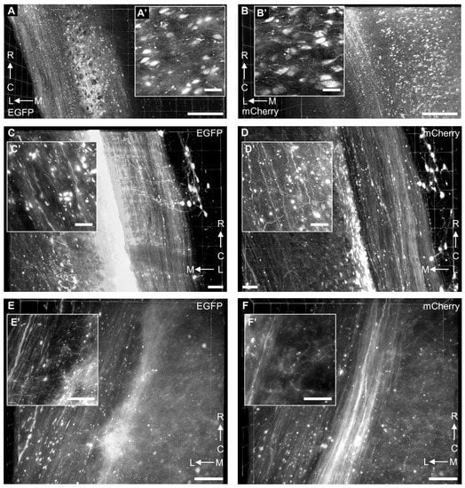 In order to detect the axons of supraspinal neurons at spinal levels, the cervical and thoracic spinal cords were cleared by tDISCO. The high-resolution images were captured by LSFM equipped with a 20× objective (NA, 1.0). The EGFP+ and mCherry+ spinal interneurons were observed in injection sites (Figure 5A,B). The high magnification images showed interneurons in single-cell resolution (Figure 5A’,B’). The supraspinal axons in white matter and their collateral branches in gray matter were also observed in the cervical spinal cords rostral to the injection site (Figure 5C,D,C’,D’) and middle thoracic spinal cords (Figure 5E,F,E’,F’).
