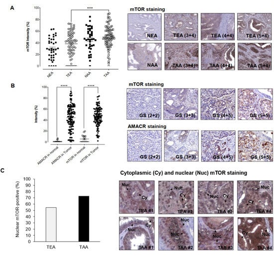 Previously, our mRNA profiling, RT-qPCR, and Western blot results demonstrated that mTOR, targeted and inhibited by miR-99b-5p, is upregulated in AA PCa vs. EA PCa [,]. To further evaluate whether mTOR could serve as a potential diagnostic and/or prognostic biomarker for AA PCa (or PCa in general), IHC assays were performed to examine the mTOR expression levels in PCa specimens derived from two independent cohorts of PCa patients. Firstly, a formalin-fixed paraffin-embedded (FFPE) tissue microarray (TMA), containing cancerous specimens and adjacent normal tissues from 40–50 EA PCa and 40–50 AA PCa patients, and normal prostate tissues from 3 EA and 3 AA healthy individuals, was used to evaluate whether mTOR is differentially expressed between EA PCa and AA PCa. The IHC staining results have confirmed that AA PCa exhibited higher mTOR expression when compared to EA PCa. Quantification of mTOR intensities demonstrated that mTOR protein levels in tumorous AA PCa (TAA) specimens were significantly higher than tumorous EA PCa (TEA) specimens (Figure 1A, left panel). By comparing AA PCa and EA PCa samples with comparable Gleason scores (GS), significantly higher mTOR intensities were also observed in AA PCa vs. EA PCa specimens (Figure 1A, right panel). Notably, significantly higher mTOR expression was detected even in noncancerous NAA samples vs. NEA samples (Figure 1A, left and right panels), suggesting that mTOR may be a predisposing risk factor in AAs (who have higher chance to develop aggressive types of PCa).
