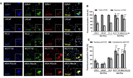 Immunofluorescence staining demonstrated higher expression levels of mTOR, nuclear mTOR, and nuclear pmTOR in AA PCa when compared to EA PCa cells. (A) Immunofluorescence showing mTOR (green fluorescence) and pmTOR (red fluorescence) signals in EA PCa cell lines (22Rv1, LNCaP and PC-3), and AA PCa cell lines (RC77 T/E and MDA PCa 2b). Nuclei were visualized by counterstaining with DAPI (blue fluorescence). Merged images were achieved by overlaying DAPI, mTOR and pmTOR signals to identify colocalization (yellow) of mTOR and pmTOR in nuclei. Fluorescent image capturing and analysis were performed using CellScans software V1.18. (B) Total mTOR and nuclear mTOR signals in EA and AA PCa cell lines. Fluorescence mTOR- or pmTOR-positive cells (%) were determined based on (number of mTOR or pmTOR-positive cells/number of DAPI-positive cells) × 100%. Significance was determined based on ANOVA with Tukey’s post-hoc test (* p-value < 0.001 in 22Rv1 vs. RC77 T/E or vs. MDA PCa 2b, ** p-value < 0.001 in LNCaP vs. RC77 T/E or vs. MDA PCa 2b, and *** p-value < 0.001 in PC-3 vs. RC77 T/E or vs. MDA PCa 2b). (C) Distribution of cytoplasmic and nuclear pmTOR in EA and AA PCa cell lines. Significant difference of nuclear mTOR (* p-value < 0.001 in 22Rv1 vs. RC77 T/E or vs. MDA PCa 2b, ** p-value < 0.001 in LNCaP vs. RC77 T/E or vs. MDA PCa 2b, and *** p-value < 0.001 in PC-3 vs. RC77 T/E or vs. MDA PCa 2b) and nuclear pmTOR (# p-value < 0.001 in 22Rv1 vs. RC77 T/E or vs. MDA PCa 2b, ## p-value < 0.001 in LNCaP vs. RC77 T/E or vs. MDA PCa 2b, and ### p-value < 0.001 in PC-3 vs. RC77 T/E or vs. MDA PCa 2b) were shown in AA PCa vs. EA PCa. The statistics were determined based on ANOVA with Tukey’s post-hoc test, and each value was represented as mean ± SEM (n = 6).