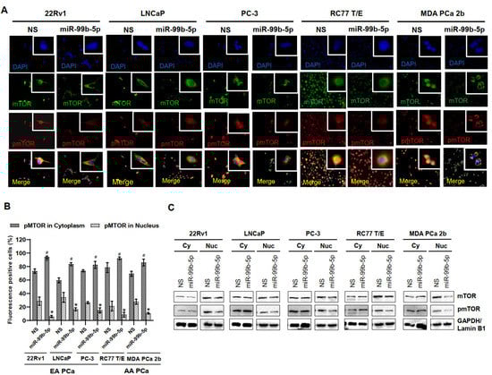 Transfection of miR-99b-5p mimic attenuates mTOR and pmTOR expressions and blocks the translocation of pmTOR to the nuclei. (A) Immunofluorescence showing cytoplasmic and nuclear localizations of mTOR (green fluorescence) and pmTOR (red fluorescence) in EA PCa cell lines (22Rv1, LNCaP and PC-3) and AA PCa cell lines (RC77 T/E and MDA PCa 2b) transfected with NS or miR-99b-5p mimic. The nuclei were visualized by counterstaining with DAPI. (B) Quantification analysis of cytoplasmic and nuclear distribution in EA and AA PCa cells. Significant increase in cytoplasmic pmTOR (# p-value < 0.01 using ANOVA with Tukey’s post-hoc test) and a significant decrease in nuclear pmTOR (* p-value using ANOVA with Tukey’s post-hoc test) was observed in the miR-99b-5p mimic vs. NS transfected cells. Each value was represented as mean ± SEM (n = 6). (C) Western blot analysis of mTOR and pmTOR in cytoplasmic and nuclear fractions of EA and AA PCa cell lines transfected with NS or the miR-99b-5p mimic. The representative images shown here were selected from 3–4 independent Western blot results. GAPDH and Lamin B1 were used as endogenous controls for cytoplasmic (Cy) and nuclear (Nu) proteins, respectively.