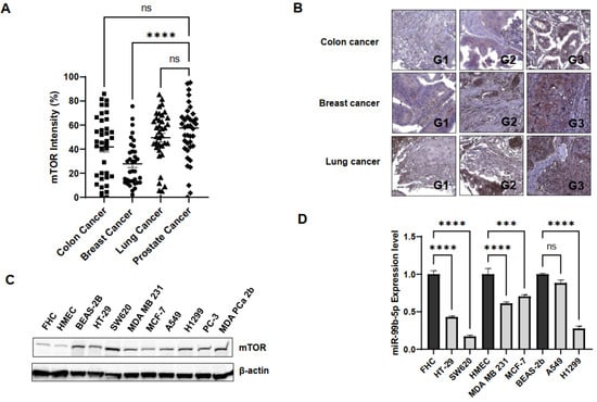 To further validate mTOR and miR-99b-5p expression levels in the in vitro cancer cell line models, Western blot analysis and RT-qPCR assays were conducted in a panel of colon, breast, lung, and prostate cancer cell lines. First, the Western blot analysis has shown that mTOR is upregulated in colon cancer (HT-29 and SW620) vs. normal colon (FHC) cells, in breast cancer (MDA MB 231, MCF-7) vs. normal breast (HMEC) cells, in lung cancer (A549 and H1299) (Figure 4C). Note that all the cancer cell lines expressed similar mTOR levels when compared to the mTOR-expressing PCa cell lines (PC-3 and MDa PCa 2b). The only exception is that normal lung cell line BEAS-2B also expresses mTOR with comparable level as other cancer cells (Figure 4C).