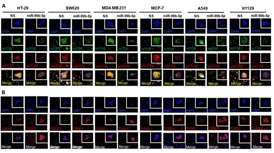 Overexpression of miR-99b-5p changes the subcellular distribution of mTOR and pmTOR and initiates cell apoptosis. (A) Immunofluorescence assays were used to visualize the subcellular localization of mTOR (green fluorescence) and pmTOR (green fluorescence) signals in cancer cell lines (HT-29, SW620, MDA MB 231, MCF-7, A549, and H1299) transfected with NS or miR-99b-5p mimic. Nuclei were visualized by counterstaining with DAPI. (B) TUNEL assays were used to visualize the DNA damages created during apoptotic events in the cancer cell lines upon miR-99b-5p and NS transfections. Apoptotic events were detected based on the DNA damages (visualized as red fluorescent spot signals, TUNEL panel) in the nuclei (blue, DAPI panel). The red/purple signals shown by overlaying DAPI and TUNEL signals (Merge panel) indicated apoptotic activities (DNA damages occurring in the nuclei) in the cancer cells.