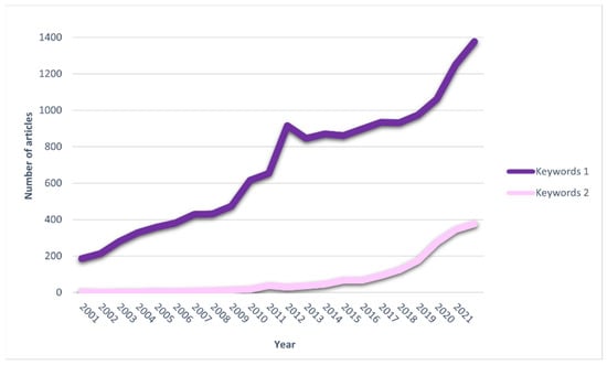 Graphical representation of the publication trend in the field of using plants related to their influence on the skin and microbiota. A graph was created based on the Scopus database, keywords 1 (plant material or plant extract and skin) and keywords 2 (plant material or plant extract and microbiota) were used.