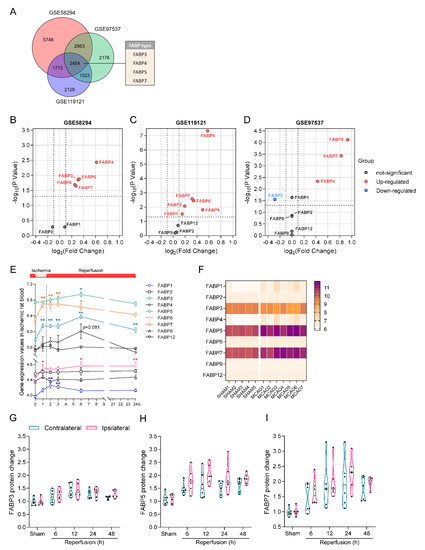 Differentially expressed genes (DEGs) induced by ischemic stroke. (A) A Venn diagram showing the overlap of DEGs among blood samples from ischemic stroke patients (GSE58294, 24 h after stroke), blood samples from MCAO rats (GSE119121, 6 h after MCAO), and brain tissue samples from MCAO rats (GSE97537, 24 h after the reperfusion). (B–D) Volcano plots showing p-values and log2 fold changes of gene expression for the three RNA-seq datasets in (A). Significant genes at p < 0.05, significantly up-regulated genes (Red dots), significantly down-regulated genes (blue dots) and non-significant genes (black dots). (E) FABP mRNA in whole blood was measured at 0, 1, 2, 3, 6 and 24 h after the onset of cerebral ischemia. (n = 8 per group, GSE119121). The data shown in each case represent the mean ± SEM. * p < 0.05, ** p < 0.01 vs. 0 h. (n = 8 per group) (F) Heatmap showing FABP gene expression levels in the brain of MCAO and sham rats 24 h after ischemia–reperfusion (GSE97537). (G–I) Mice received right cerebral ischemia for 2 h. Protein levels of FABPs in ischemic ipsilateral and contralateral non-ischemic brain tissue at 6, 12, 24 and 48 h after reperfusion. (n = 6 per group).