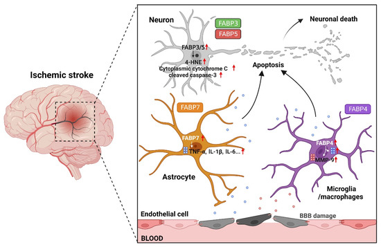 A schematic diagram of the pathway of Faty acid-binding proteins (FABPs) involved in the ischemic injury of neurovascular units. FABP3 and FABP5 are overexpressed in ischemic neurons, mediate oxidative stress, and directly participate in ischemic neuronal death. FABP4 expressed in microglia stimulates the expression and release of pro-inflammatory cytokines (IL-1β, IL-6, TNF-α), and matrix metalloproteinase MMP-9 activates extrinsic apoptotic signals in ischemic neurons and disrupts the blood–brain barrier (BBB). FABP7 enhances the pro-inflammatory expression of astrocytes and stimulates ischemic neuronal apoptosis through inflammation. The figure was created with BioRender.com.