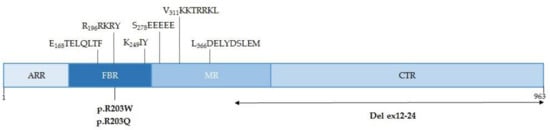 The three-dimensional (3D) structure of PACS-1 is still unknown. Some attempts have been made using ab-initio modeling, such as the one described for residues located between V117 and D300, which are predicted as a globular domain []. Different unpublished analyses performed using structure prediction systems using hidden Markov models [,] roughly coincide in predicting a globular structure for the C-terminal subdomain (residues from R622 to L956), similar to a regulatory subunit of phosphoinositide 3-kinase. They also predict a structure similar to a C2 domain (calcium/lipid-binding domain) for the segment between amino acids P98 and E261, which would include the amino acid R203 (variant p.R203W). Unfortunately, not all of these data are conclusive. Future knowledge of the structure of PACS-1 would be key to knowing more accurately how the mutations in the protein affect its structure and to developing therapies that are more precise for these patients.