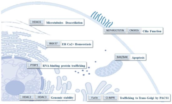 The first described function of the PACS-1 protein was its role in the regulation of membrane traffic proteins. This specific function is well known and conserved among vertebrates in PACS proteins. The activation mechanism involves the phosphorylation of its S278 residue by CK2. The activated PACS-1 protein is able to bind its client proteins, transferring them to their final location. It mediates the trafficking of proteins from the plasma membrane to the early endosomes (SorLA) [] and from the late endosomes to the trans-Golgi network (TGN) (furin, CI-MPR) [,]. Moreover, some proteins related to the function of the primary cilium, such as nephrocystin or CNGB1b, are also trafficking [,]. Besides, PACS-1 has been linked to the cytosolic HDAC6, which is involved in the deacetilation of microtubules, in the Golgi integrity and cilium retraction [,].