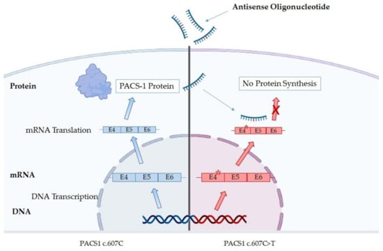 The antisense oligonucleotides (ASOs) can specifically target the mutated mRNA of PACS1, avoiding the translation of the pathologic protein [] (Figure 3). The company IONIS is collaborating with the PACS1 foundation in order to develop an ASO targeting the p.R203W variant [], and, nowadays, it is an active research field. However, ASOs are incapable of crossing the blood brain barrier (BBB) and require direct central nervous system (CNS) administration, so intrathecal delivery is recommended [].