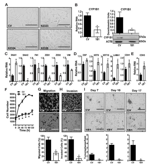 Stable CYP1B1 knockdown decreases mesenchymal phenotypes in MDA-MB-231 cells. (A) MDA-MB-231 cells were transduced with control vector (CV) or CYP1B1 short hairpin RNA (shRNA) Lentiviral Transduction Particles (62323, 62324, or 62326). Representative microscopic images at 200× magnification; scale bar, 200 µm. (B) Stable KD of CYP1B1 cell line 62326. Cells grown for more than 5 passages were analyzed for RNA (left panel) or protein normalized to ACTB (right panel). Values are the mean ± SD, n = 3, relative to CV, set at a value of 1.0. The * indicates a significant difference (p ≤ 0.05) between CV and CYP1B1 KD (shRNA) cells by Student’s t-test. (C) Quantitative PCR (qPCR) analysis of mesenchymal marker transcripts. Values are the mean ± SD, n = 3, relative to CV. The * indicates a significant difference (p ≤ 0.05) between CV and CYP1B1 KD cells (62326, here and below) by Student’s t-test. (D) qPCR analysis of epithelial marker transcripts. Values are the mean ± SD, n = 3, relative to CV. The * indicates a significant difference (p ≤ 0.05) between CV and CYP1B1 KD cells by Student’s t-test. (E) qPCR analysis of CDH3 transcripts. Values are the mean ± SD, n = 3, relative to CV. The * indicates a significant difference (p ≤ 0.05) between CV and CYP1B1 KD cells by Student’s t-test. (F) Cell proliferation was assayed at the indicated times. Values are the mean ± SD, n = 7; * indicates a significant difference (p ≤ 0.05) between CV and 1B1 KD cells by two-way analysis of variance (ANOVA) followed by Tukey’s multiple comparisons. (G) Cell migration. Top, microscopic images of invading cells; scale bar, 200 µm Bottom, results expressed as a percentage of CV; values are the mean ± SD, n = 5. The * indicates a significant difference (p ≤ 0.05) between CV and CYP1B1 KD cells by Student’s t-test. (H) Cell invasion through Matrigel. Top, microscopic images of invading cells scale bar, 200 µm. Bottom, results expressed as percentage of CV; values the mean ± SD, n = 5. The * indicates a significant difference (p ≤ 0.05) between CV and CYP1B1 KD cells by Student’s t-test. (I) Multiple spheroid formation. Top, microscopic images of CV and CYP1B1 KD cells grown in Matrigel suspension at the indicated days in culture; scale bar, 400 µm. Bottom, values are the mean ± SD, n = 3; * indicates a significant difference (p ≤ 0.05) between CV transduced cells and 1B1 shRNA transduced cells by Student’s t-test at each time.