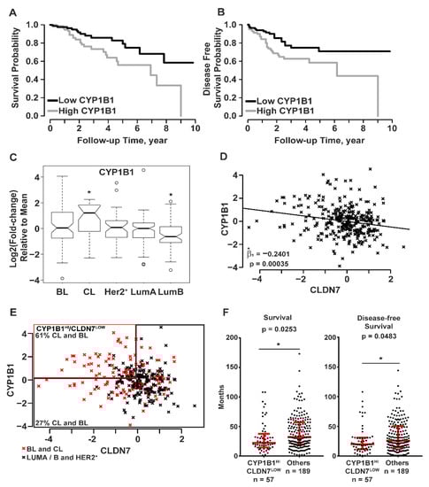 Microarray gene expression data with corresponding clinical data of breast cancer samples were accessed from the UNC Microarray Database, UNC337 [5]. Breast cancer samples were divided into tertiles by CYP1B1 RNA levels: low, medium, and high. Samples with the highest CYP1B1 RNA levels were compared to samples with the lowest CYP1B1 RNA levels. Kaplan-Meier analysis demonstrated that breast cancer patients with high CYP1B1 expression had decreased probability of overall survival (Figure 3A) and disease-free survival (Figure 3B) than those with low CYP1B1 expression. Further analysis considered the expression of CYP1B1 within five intrinsic subtypes: BL, CL, HER2+, LumA, and LumB [5,8]. CYP1B1 expression was significantly higher in CL samples, and significantly lower in LumB samples (Figure 3C). Linear regression analysis identified a significant negative regression coefficient representing CYP1B1 and CLDN7 RNA levels (Figure 3D). Grouped by CYP1B1HI/CLDN7LOW, 61% of CL and BL samples contained more CYP1B1HI/CLDN7LOW samples while 27% of all other samples were CYP1B1HI/CLDN7LOW (Figure 3E). Comparison of CYP1B1HI/CLDN7LOW CL and BL samples to all other samples revealed a significant decrease in the median survival and disease-free survival of patients identified as CYP1B1HI/CLDN7LOW (Figure 3F). Overall, these analyses of this set of clinical data showed a negative correlation of expression of CYP1B1 and CLDN7 in breast cancer, consistent with our findings in CL TNBC (Figure 2). Moreover, these results indicate that patients with CYP1B1HI/CLDN7LOW tumors may have a poorer prognosis.