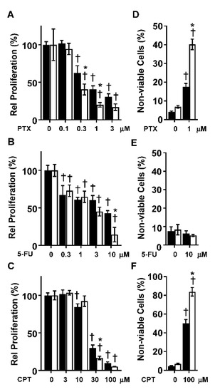 PTX (T7402, Millipore Sigma, Burlington, MA, USA), 5-FU (F6627, Millipore Sigma), CPT (22-515-0, Thermo Fisher Scientific) and TMS (10038, Cayman Chemicals, Ann Arbor, Michigan, USA) were dissolved in dimethyl sulfoxide (DMSO; D2650, Millipore Sigma). The final concentration of DMSO in the media did not exceed 0.1%.
