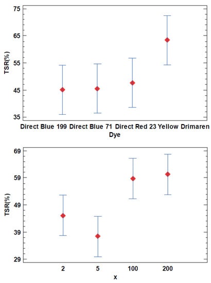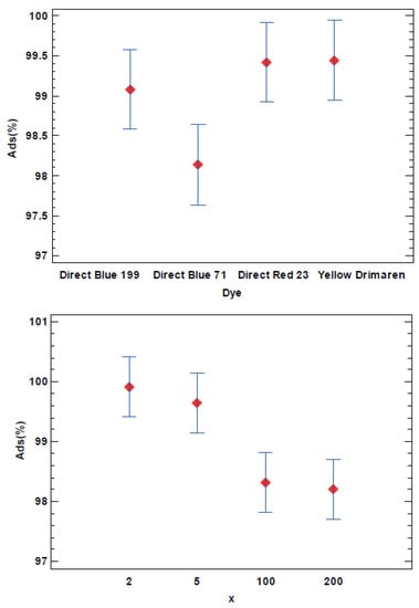 Table 2 shows that both of the selected factors, i.e., the dye structure and the nanoclay/dye ratio (x), are significant in the cleaning or hybrid synthesis process that it is studied. The AB interaction is not significant, which means that the trends observed in the main factors are the same as that observed in the interaction (