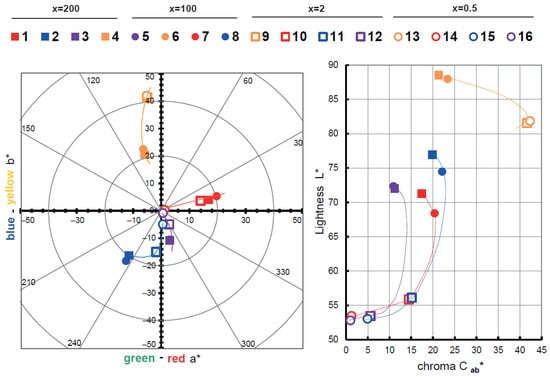 However, the sample with x = 2 with the Direct Red 23, Direct Blue 71, and Direct Blue 199 are apparently achromatic as compared with the less concentrated samples at x = 0.05 with the same dyes. The chroma is affected by the dye concentration and the hue. With yellow samples, it is more difficult to get darker and achromatic samples, as we can see in the L*-Cab* highlighted areas. In addition, as the dye ratio increases (x decrease), the samples L* is low and the chroma decrease, allowing a wider range of colors to be covered. There is a hue shift towards green in the Direct Blue 199 samples when the concentrations increase to x = 100 and 200. The color range represented by the area under the L* Cab* diagrams is bigger with the samples with the Direct Blue 199 than the samples with the Direct Blue 71 which are less chromatic and less bright. Finally, the color range with the samples with Direct Red 23 is wider in the samples with Direct Blue 71.
