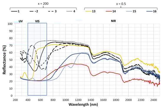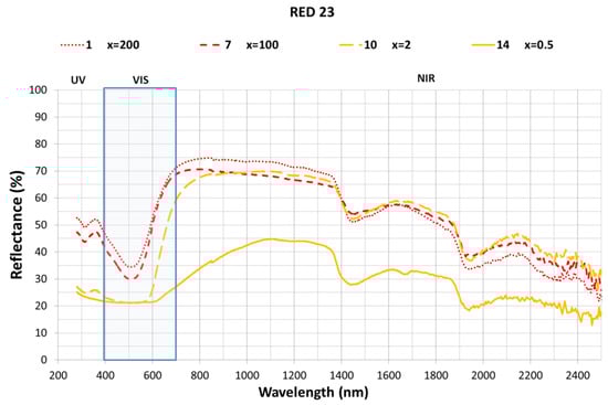 Figure 4, the Direct Red 21 dye and all its hybrids are studied to assess how this change in concentration affects the results. As can be observed, the dye concentration affects the hybrid pigment reflectances and dye ratio increases (lower × values), the reflectance factor 𝜌 (%) decreases over all the spectra measured. The differences in the visible light between the x = 2 and x = 0.05 samples seems low, but those differences increase significantly in the near infrared from 700–2400 nm affecting the final TSR (%) value. This means that hybrid pigments with similar color perception, can obtain different TSR (%) values affecting the future applications that should be considered.