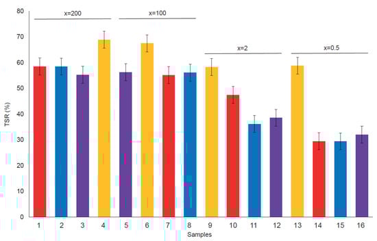 Figure 5, shows TSR (%) values seem to be correlated with the nanoclay/dye concentration. As can be expected, the samples with low L* values have low TSR (%) due to the lower reflectance mainly in the visible spectrum. In addition, yellow samples have more TSR (%) for the same reasons. However, more differences can be found between all the dye structures and x ratios but is not possible to know if those differences are stastically significant without the variance analysis.