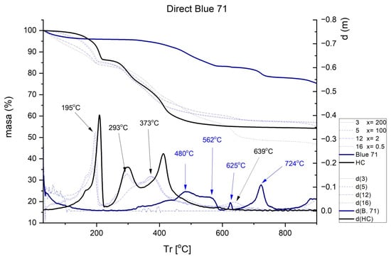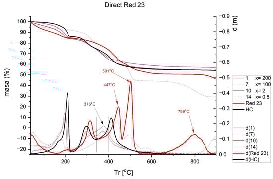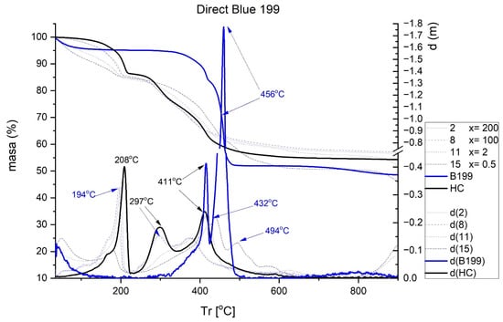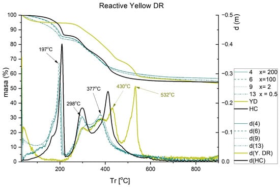 Figure 10. Each figure shows the degradation vs. temperature curves of each colorant (B199, B71, R23, and YD) and the degradation of the nanoclay (HC) is also analyzed. The curves at the bottom of each graph show the lines d(YD), d(B71), d(R23), d(B199), and d(HC), which are derived from the first curves indicating specific degradation peaks (DTGA). The results show that, on the one hand, Direct Red 23 and Reactive Yellow start to degrade earlier, but their decline is gradual and less marked within a range of approximately 217–556 °C. On the other hand, Blue 199 shows a marked peak at 367–482 °C. The degradation of Direct Blue 71 is the lowest and its degradation is the slowest.