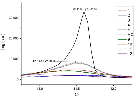 29]. Between 11 and 12 degrees there is a peak that shows the described characteristic and, as in the case of calcined hydrotalcite (HC), this peak disappears due to the opening of said layers.