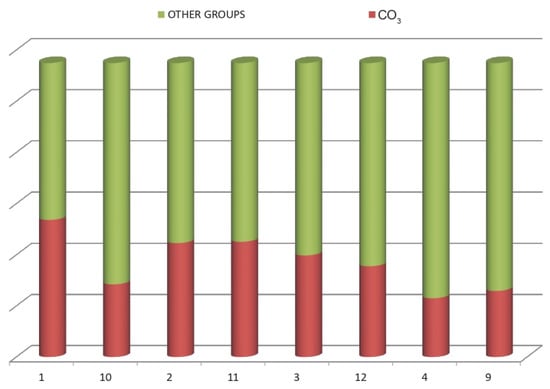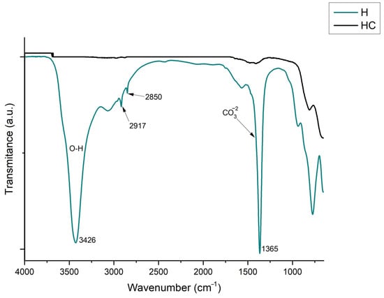 Figure 17. This figure shows how the amount of carbonate that was originally in the hydrotalcite has been reduced as, after the calcination and reconstruction of the nanoclay, the colorant became part of the nanoclay structure, occupying a large part of this OH