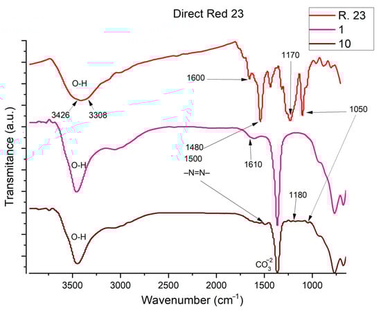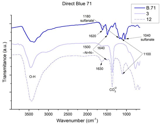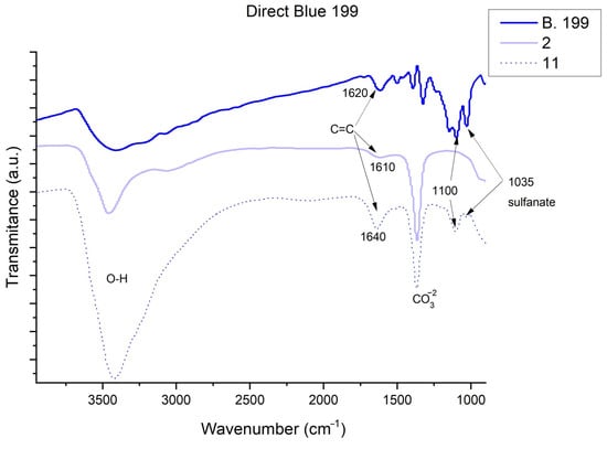 48]. Many of the peaks confirm the presence of the dye with more or less intensity, or do not appear at low concentrations (Samples 2 and 3), but they are appreciated when we study them in Samples 11 and 12 when we find more peaks associated with the dye adsorbed by nanoclay (look at the peaks at 1500 and 1100 cm