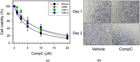 Compound C (CompC) reduced the viability of Renca renal carcinoma cells in a dose-dependent manner. (a) Renca, A498, Caki-1, and Caki-2 cells were seeded onto 24-well plates, cultured for one day, and treated with the vehicle, dimethyl sulfoxide (DMSO), or various concentrations of CompC (0, 1, 2.5, 5, 10, and 20 μM) in the culture media. After two days, a 3-(4,5-dimethylthiazol-2-yl)-2,5-diphenyltetrazolium bromide (MTT) assay was performed and the percentage of cell viability is plotted as the mean ± standard deviation (SD) with n = 20. (b) Subconfluent Renca cells were cultured in the presence of vehicle or 10 μM CompC for one–two days. The cell morphology was observed through and photographed by an inverted microscope (100×).