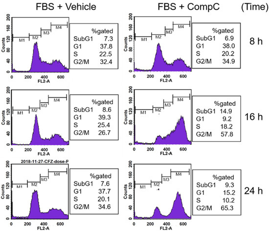 To confirm whether CompC inhibits cell proliferation by cell cycle arrest, DNA content of the cells was evaluated by flow cytometry after staining the nuclei with propidium iodide (PI). For the experiment, Renca cells were serum starved by incubation with a serum-free medium (SFM) containing 0.1% bovine serum albumin (BSA) overnight. After pretreatment with the vehicle (DMSO) or 10 μM CompC for 1 h, the cells were stimulated with serum (10% FBS) for the indicated times (8–24 h). The data showed that CompC increased the number of cells in the G2/M fraction from 32.4 to 34.9% at 8 h, from 26.7 to 57.8% at 16 h, and from 34.6 to 65.3% at 24 h (Figure 2). On the other hand, it reduced cells in the G1 phase from 37.8 to 38.0% at 8 h, from 39.3 to 9.2% at 16 h, and from 37.7 to 15.2% at 24 h and those in the S phase from 22.5 to 20.2% at 8 h, from 25.4 to 18.2% at 16 h, and from 20.1 to 10.2% at 24 h (Figure 2). These results suggest that CompC inhibits cell proliferation by inducing G2/M cell cycle arrest and reducing cell cycle progression to the G1 and S phases through mitosis in Renca cells.