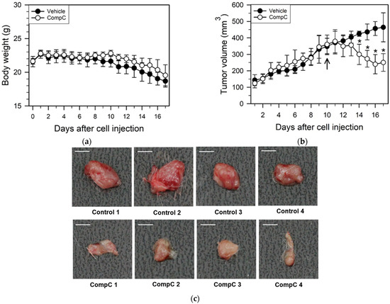 CompC inhibited the growth of Renca xenografts in BALB/c syngeneic mice. Ten days after the subcutaneous injection of Renca cells (arrow), vehicle or CompC (2.5 mg/kg/day) was intraperitoneally injected to the tumor-bearing BALB/c mice. During the experimental period, the body weight and tumor volume were recorded every day. The Kruskal–Wallis H test followed by a Bonferroni-corrected Mann–Whitney U test were used as a post-hoc comparison of the daily tumor volume in the mouse model. Significant difference in the tumor volume between vehicle and CompC injection groups at each day is marked with an asterisk. The means and SD are plotted (n = 5 for biological replicates at each time points in (a,b)). * p < 0.01, compared with the vehicle-injected control mice. Seven days after daily vehicle/CompC injection, the animals were euthanized, and tumors were excised and photographed (c).