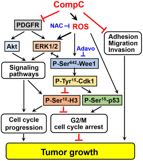 Taken together, our results suggest that CompC may exert anti-tumor effect in vivo by suppressing cell cycle progression, adhesion, migration, and invasion. As shown in the schematic representation (Figure 9), CompC suppresses cell cycle progression in Renca cells by inhibiting PDGFR-dependent signal transduction including Akt and inducing ROS-dependent cell cycle arrest through ERK1/2 activation, Wee1 activation, Cdk1 inhibition, and subsequent histone H3 inactivation. Activation of p53 through ROS production or other signaling pathways also plays an important role in cell cycle arrest. In addition to inhibiting cell cycle progression or cell cycle arrest, CompC also inhibits Renca cell adhesion, migration, and invasion. The molecular mechanisms for CompC-dependent suppression of adhesion, migration, and invasion have yet to be clarified.
