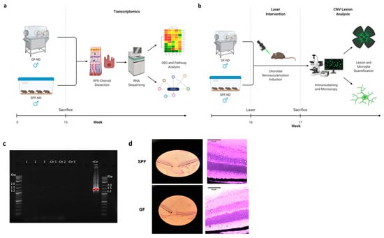 In this current study, we analyzed the transcriptome of the RPE/choroid in germ-free (GF) mice on normal diet (ND) compared to isogenic control specific pathogen-free (SPF) mice. Performing high-throughput RNA sequencing of the RPE/choroid in these two groups, we investigated the overall interaction between the microbial organ and RPE/choroidal tissue (Figure 1a). Furthermore, we studied the effect of the microbiome on neovascular AMD, utilizing a specialized laser-induced choroidal neovascularization (CNV) model we have developed for GF mice in order to examine differences in CNV size and inflammatory response (Figure 1b). Validity of this animal model was further demonstrated through several assays, including a sterility check of GF mice (Figure 1c) and characterization of retinal morphology to confirm there were no differences between SPF and GF mice at baseline (Figure 1d). Together, these results illustrate which RPE/choroidal genes and pathways are modulated by the microbiome and how they correlate with neovascular features of AMD, providing evidence for a potential gut–RPE/choroidal axis in addition to the gut–retina axis and its potential role in AMD.