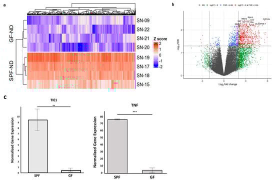 In order to examine the impact of the microbial organ on gene expression in the RPE/choroid, RNA sequencing was performed on GF-ND and SPF-ND mice, with four RPE/choroid samples per group. Using stringent criteria of FDR < 0.05 and log2FC > 2, we identified 660 highly significant differentially expressed genes (DEGs). A heatmap was plotted to show the hierarchical clustering of the DEGs (Figure 2a). A large majority of these genes were downregulated in the GF-ND mice compared to the SPF-ND group, with only six genes upregulated in the GF-ND group: 4933422A05RIK, MID1-PS1, DLL3, B230112G18RIK, ZFP988, and GCK (Figure 2b). The top five downregulated genes in the GF-ND group, by log2FC value, were CLEC3A, SELE, LILRB4A, ALKAL2, and CCL19. At even stricter criteria of FDR < 0.01 and log2FC > 2, 130 significant DEGs were identified. At this cutoff, the top five downregulated genes in the GF-ND group were SELE, CCL19, CD244A, FOXL1, and PATL2. No genes were upregulated in the GF-ND group at this cutoff. A number of identified DEGs were validated by Real-Time Reverse Transcription-Polymerase Chain Reaction (RT-qPCR), including TIE1 (log2FC = 4.42) and TNF (log2FC = 4.05), confirming a concordant decrease in expression in the GF-ND group (Figure 2c). A full list of genes and statistics are available in Supplementary Table S1.
