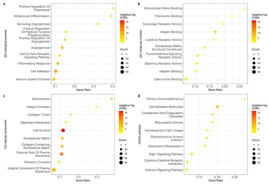 Enrichment analysis used to identify Gene Ontology showed multiple biological pathways and functions downregulated in the GF-ND group. The most significant biological processes involved various angiogenesis mechanisms including sprouting angiogenesis alongside positive and negative regulation pathways. Also included among the top 10 affected biological processes were immune system processes and inflammatory response (Figure 3a). Other highly significant processes included melanocyte differentiation, chemotaxis regulation, and cell surface receptor signaling.