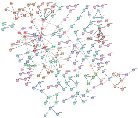 To explore the protein-level functional connection of the identified DEGs, we mapped them into the STRING (Search Tool for the Retrieval of Interacting Genes) database, which contains a wealth of validated and text-mined protein–protein interactions among the proteins []. A significantly enriched protein network was obtained from 608 mapped DEGs. We applied the Markov clustering with inflation parameter = 3 and a confidence level of 0.9 to group the proteins by the network connections. Hub gene analysis was conducted with Cytoscape [].