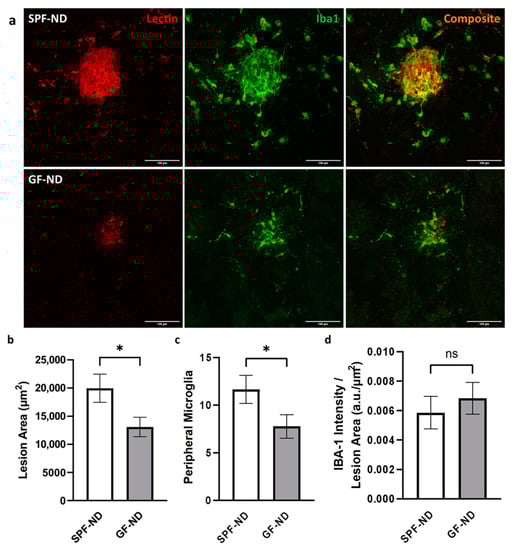 In the laser-induced CNV mouse model, the GF group showed a significantly smaller lesion area compared to their SPF-ND counterpart (Figure 5b). The average lesion area (±SEM) in the SPF-ND group was 19,955.35 ± 2512.21 μm2, and it was 13,093.37 ± 1735.68 μm2 in the GF-ND group (p = 0.029; n = 20, n = 9, respectively). Around the lesion, GF mice showed significantly lower peripheral microglia activation as well (Figure 5c). The SPF-ND group had 11.66 ± 1.48 IBA-1+ microglia compared to 7.78 ± 1.24 IBA-1+ microglia in the GF-ND group (p = 0.047). IBA-1 signal intensity (arbitrary unit, a.u.) within a given CNV lesion area showed no significant difference (p = 0.53; Figure 5d) between the SPF-ND group (0.0059 ± 0.0011 μm−2) and GF-ND group (0.0068 ± 0.0011 a.u./μm2).
