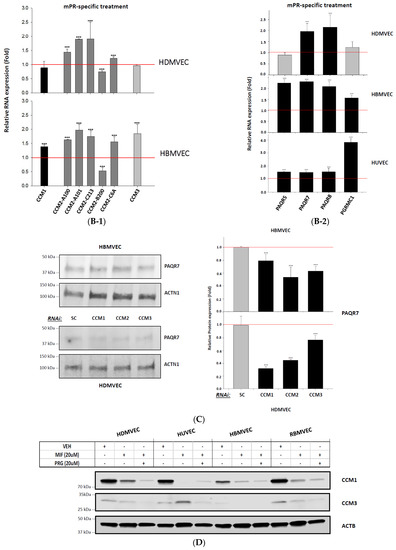 Relationships among key players (CCMs and mPRs) within the CmP network in nPR(−) endothelial cells (ECs). (A) Silencing of CCM2 decreases the expression levels of both CCM 1/3 proteins in human brain microvascular endothelial cells (HBMVEC). (A-1) After silencing all three CCMs (1, 2, or 3) for 48 h, the expression levels of all three CCM proteins were efficiently targeted and silenced; however, significantly decreased expression of both CCM1/3 proteins was observed in CCM2-KD HBMVEC cells (left upper and lower panels). The relative expression levels of CCMs (1, 2, or 3) proteins were measured through quantification of band intensities and normalized against α-actinin (ACTN1) followed by SC controls (red line), and illustrated with bar plots where light gray bars represent no change and dark gray bars display decreased relative protein levels (right panel) (n = 3). (A-2) Significantly increased RNA levels of CCM2 isoforms in both CCM1-KD and CCM3-KD in HBMVEC cells were observed. The relative transcription expression changes in CCM1, CCM3, and 5 isoforms of CCM2 in CCMs KD HBMVEC cells were measured by RT-qPCR (Fold) and illustrated in the bar plots, where light gray bars represent the relative RNA levels of CCM1, dark gray bars display relative RNA levels of CCM2 isoforms, and black bars for the relative RNA levels of CCM3 (n = 3). (B) Impacts of mPR-specific actions on the RNA expression of CCM2 isoforms and mPRs in human microvascular endothelial cells. (B-1) Under mPR-specific PRG actions (PRG + MIF) for 48 h, enhanced RNA expression levels of most CCM2 isoforms were observed in both human dermal microvascular endothelial cells (HDMVEC) and human brain microvascular endothelial cells (HBMVEC) cells, while increased RNA expression levels of CCM1/3 were only observed in HBMVECs (n = 3). (B-2) Significantly increased RNA expression of PAQR5/7/8 and PGRMC1 was observed under mPR-specific PRG actions in HBMVECs and human umbilical vein endothelial cells (HUVECs) for 48 h, while only increased RNA expression of PAQR7/8 was observed in HDMVECs, suggesting RNA expression of most mPRs can be dramatically enhanced under mPR-specific PRG actions (n = 3). (C) Impacts of mPR-specific actions on the protein expression of mPRα (PAQR7) in HDMVECs. After silencing all three CCM genes for 48 h, decreased protein expression levels of PAQR7 were observed for all 3 Ccms-KD conditions (n = 3). (D) Impacts of mPR-specific actions on protein expression levels of CCM1/3 in human microvascular endothelial cells (HDMVECs, HUVECs, and HBMVECs) and rat brain microvascular endothelial cells (RBMVECs), compared to mifepristone only (MIF, 20 µM) or vehicle controls (VEH). The relative RNA expression levels were measured through RT-qPCR from at least three different experiments (triplicates per experiment) and normalized to housekeeping gene (ACTB) and scramble control. The relative protein expression levels were measured through quantification of band intensities of targeted proteins by Western blots, subtracted from the surrounding background and normalized against control housekeeping proteins followed by vehicle controls. In all bar plots, the red line is the control baseline for fold change measurements (−/+). ++, +++ above bar indicates p ≤ 0.001 for paired t-test.